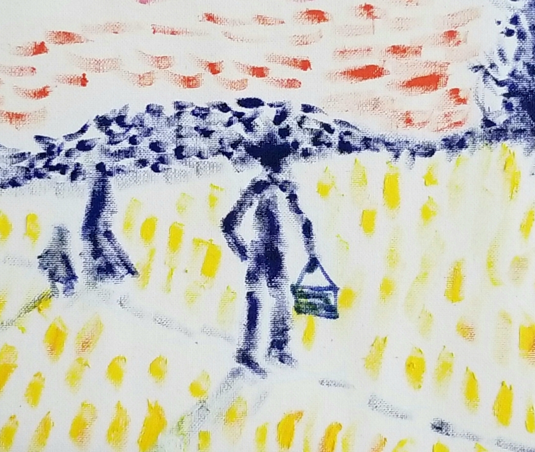 Sower of Suns 2 is a small painterly improvisation depicting an artist and a group of people returning from a plein air exercise. It employs a pointillist manner of painting and is centered on the figure of a painter compositionally.